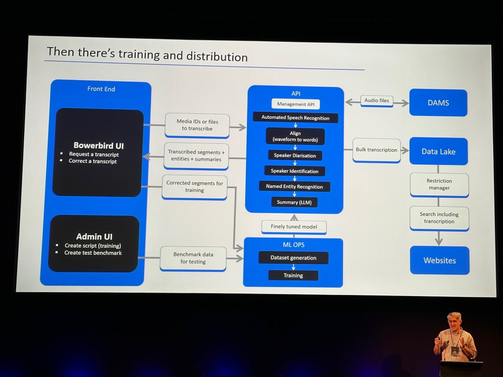 Là aussi, le déplacement vers les contrées du Pacifique permet d’apporter une perspective différente. Kathy Reid nous a ainsi montré les variations importantes dans l’analyse des différents accents anglais par Whisper, le modèle ouvert d’OpenAI qui domine actuellement le marché et a été entraîné sur 680.000 heures de contenus issus d’Internet. Les écossais sont ceux dont l’accent est le moins bien reconnu, tandis que les australiens sont obligés d’imiter l’accent américain quand ils parlent à leur téléphone pour être compris ! La NFSA nous a montré, de son côté, comment elle apprenait à Whisper à parler l’australien, en générant d’abord des histoires truffées d’argot et de noms de lieux spécifiques, avant de les faire lire à haute voix par des locuteurs nationaux, de générer des transcriptions qui sont ensuite corrigées, et enfin utilisées pour entraîner le modèle. On retiendra que c’est une méthode sacrément « bikkie » (« bikkie » est l’argot australien pour « biscuit » mais pour une raison inconnue, l’IA générative semblait penser que ça voulait dire « génial » ;-)