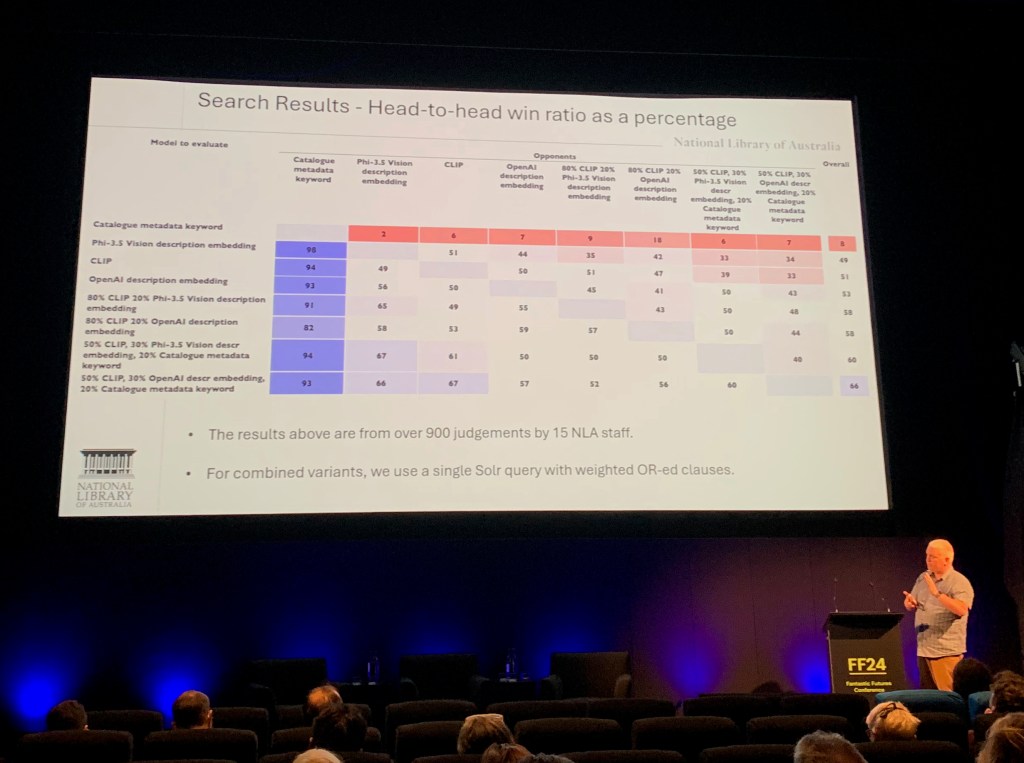 L’oralité tient en effet une place considérable dans les cultures locales, comme en témoigne l’existence d’un studio d’histoire orale au sein de la NLA (National Library of Australia) qui détient plus de 60.000 heures d’enregistrements et missionne 80 interviewers pour poursuivre ce travail. Cette collecte est considérée, au même titre que le dépôt légal des livres ou du web, comme une façon de faire entrer la culture australienne dans les collections. Les archives audiovisuelles tiennent aussi une place importante aux archives nationales d’Australie (NAA) et bien sûr, elles sont au cœur de l’activité de la NFSA. Rien d’étonnant, donc, à ce que l’un des usages de l’IA les plus mis en lumière à l’occasion de cette édition des « Futurs Fantastiques » ait été le speech-to-text.