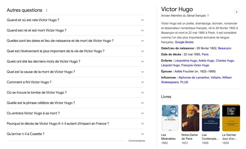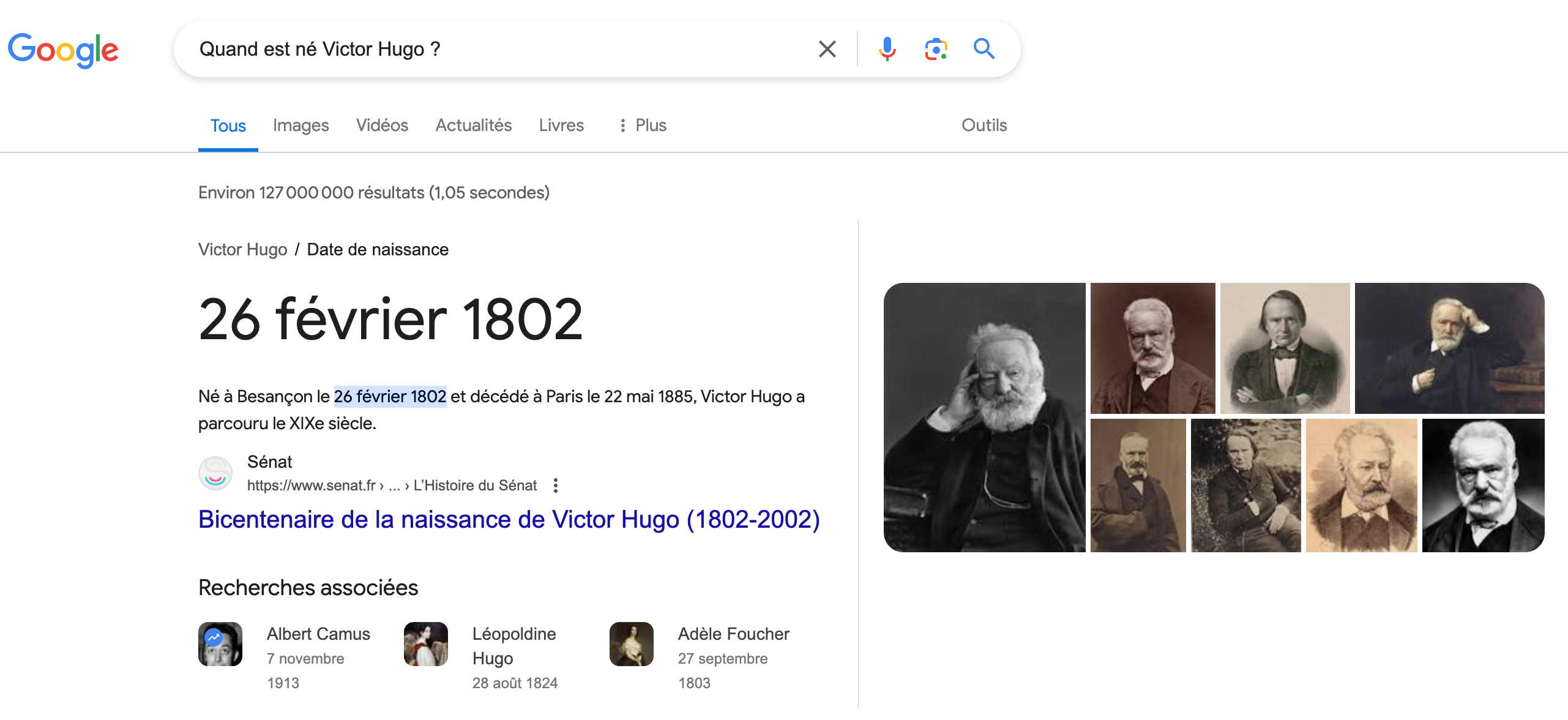 Comme nous autres bibliothécaires, Google a commencé par tenter de s’appuyer sur les métadonnées pour pouvoir répondre de manière pertinente à au moins certaines questions, avec le « knowledge graph ». Ce qui donne par exemple ceci :